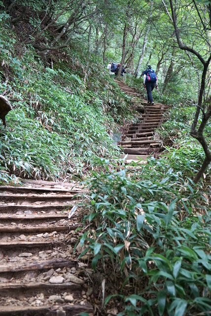 ここから本格的な登山道へ 事前調査では北アルプスの蝶ヶ岳を思わせる樹林帯の中の永遠階段 心していざ!