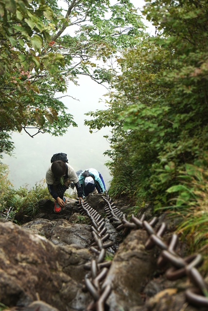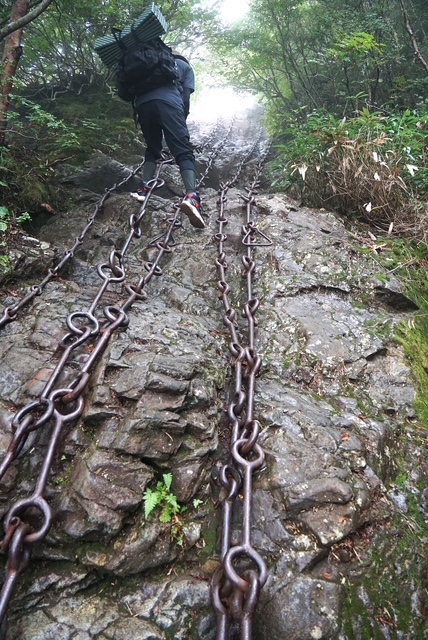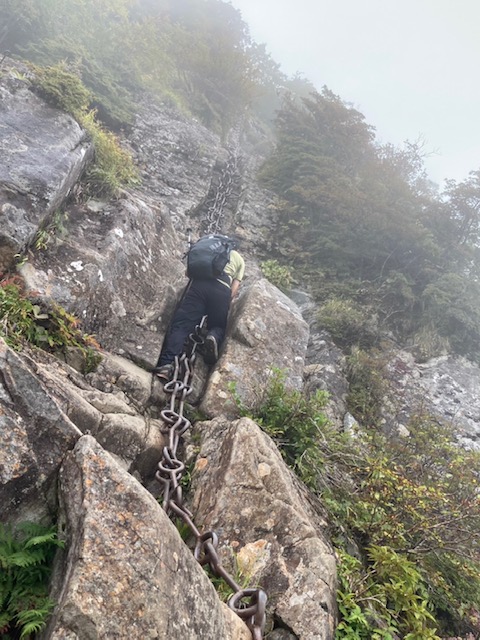 鎖は手で持つことは出来ますが硬く大きな登山靴では難しく岩の足場も乗せる所もなく更には雨で濡れており苦戦中